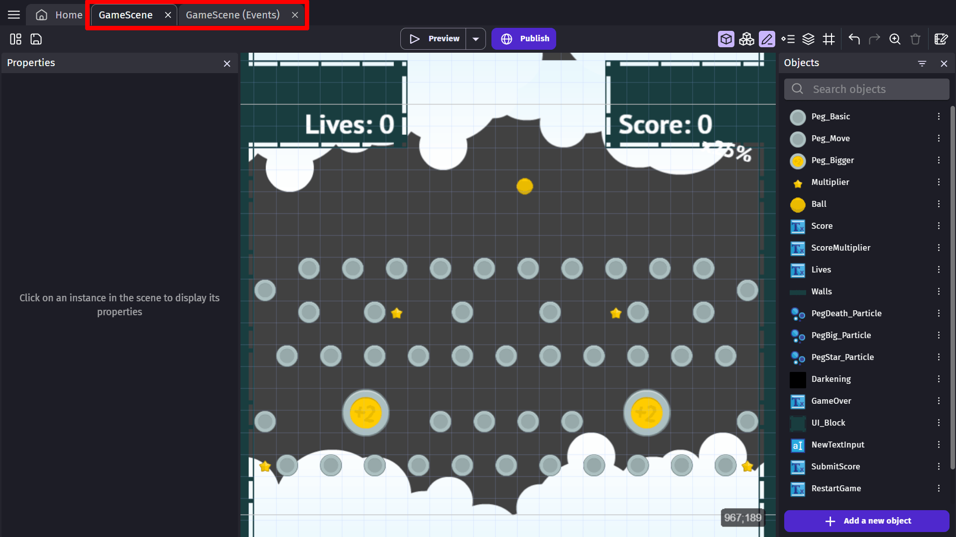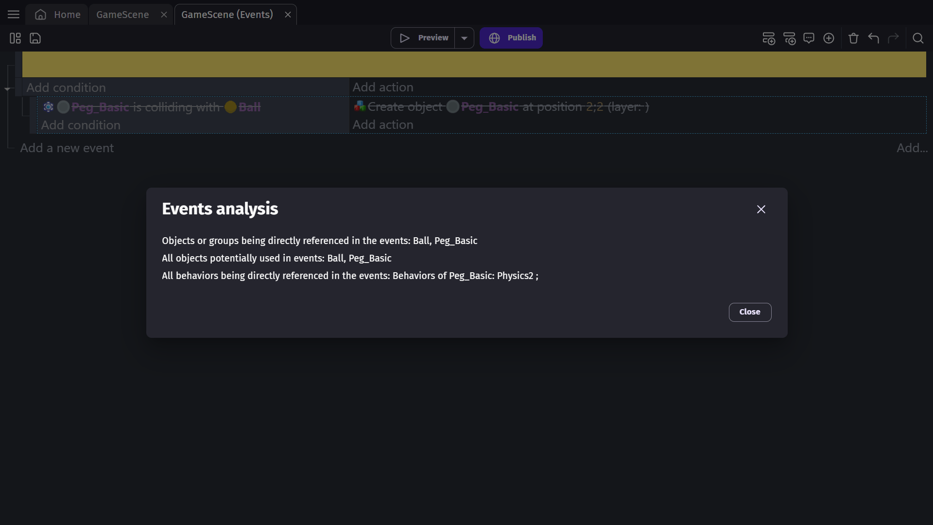 GDevelop uses a No Code Event System that has actions and conditions instead of a wall of code, these events are intuitive and able to be understood by anyone, regardless of their level of programming knowledge. The Events Editor is where you set up these events to create your game logic.