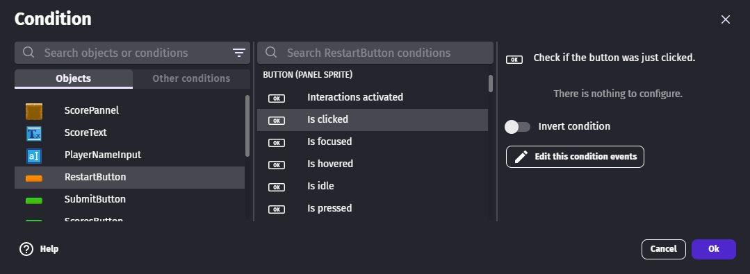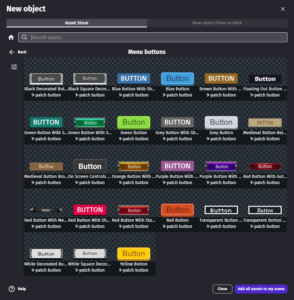 Buttons are an essential part of many games: they are used in menus, in the game and can be part of the gameplay. Buttons can be constructed in different ways in GDevelop. You can build your own with a mix of Sprite, Tiled Sprite, Shape Painter and Text objects. Often, it's easier to go with a ready-to-use button available in the Asset Store.
