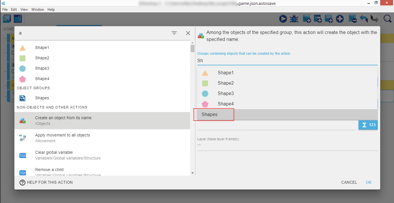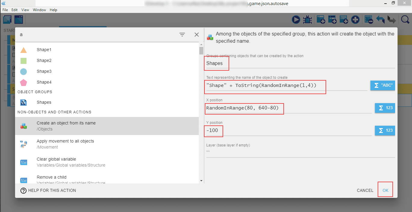 The three values we will enter are: "Text representing the name of the object to create", "X position", and "Y position". Name it "Shape" + ToString(RandomInRange(1,4)), so that whenever a new object is created, it will be one of the four available shapes.