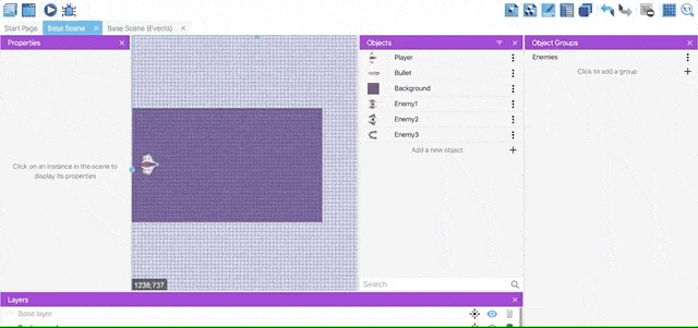 We'll now create an object group called "Enemies". This will be useful in events, to refer to all the objects in the group without repeating events for each object.
